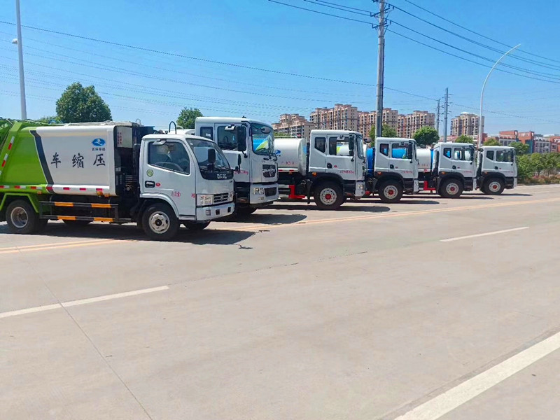 此次發(fā)車的5臺(tái)15噸東風(fēng)D9灑水車和一臺(tái)5方東風(fēng)D6壓縮垃圾車均為湖南湘潭某物業(yè)公司,用戶城市道路沖洗和垃圾專用工作。