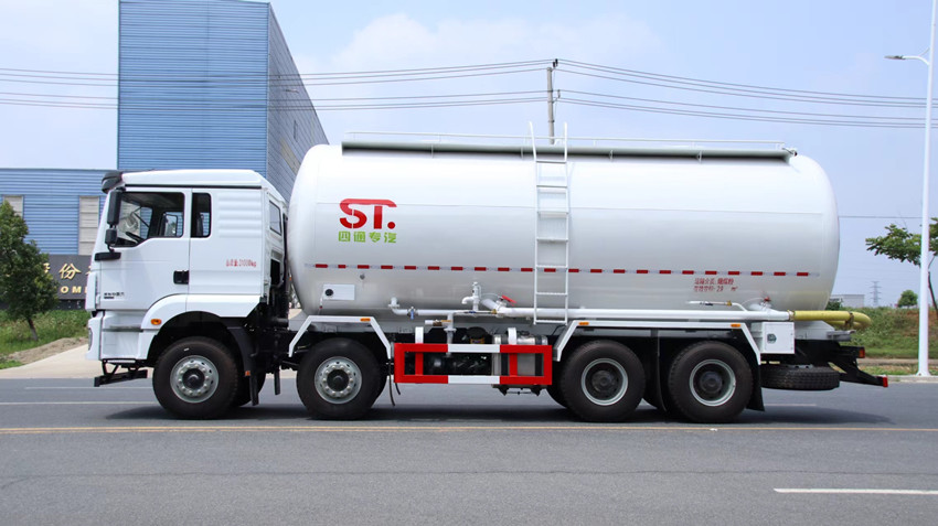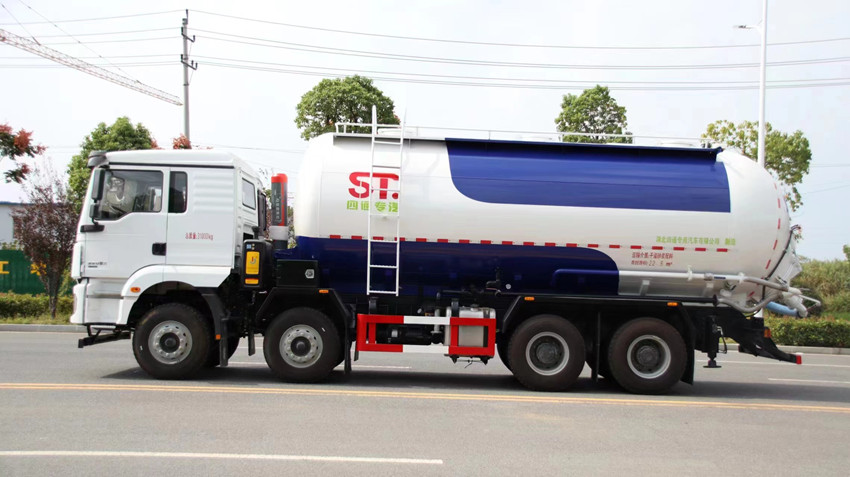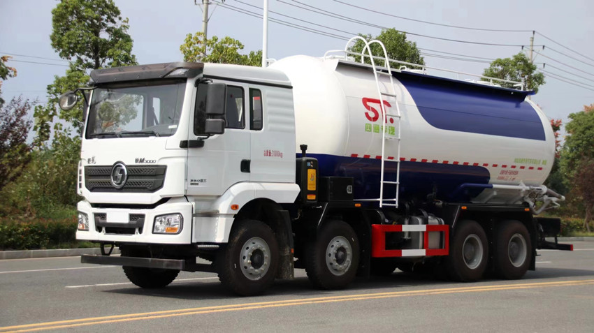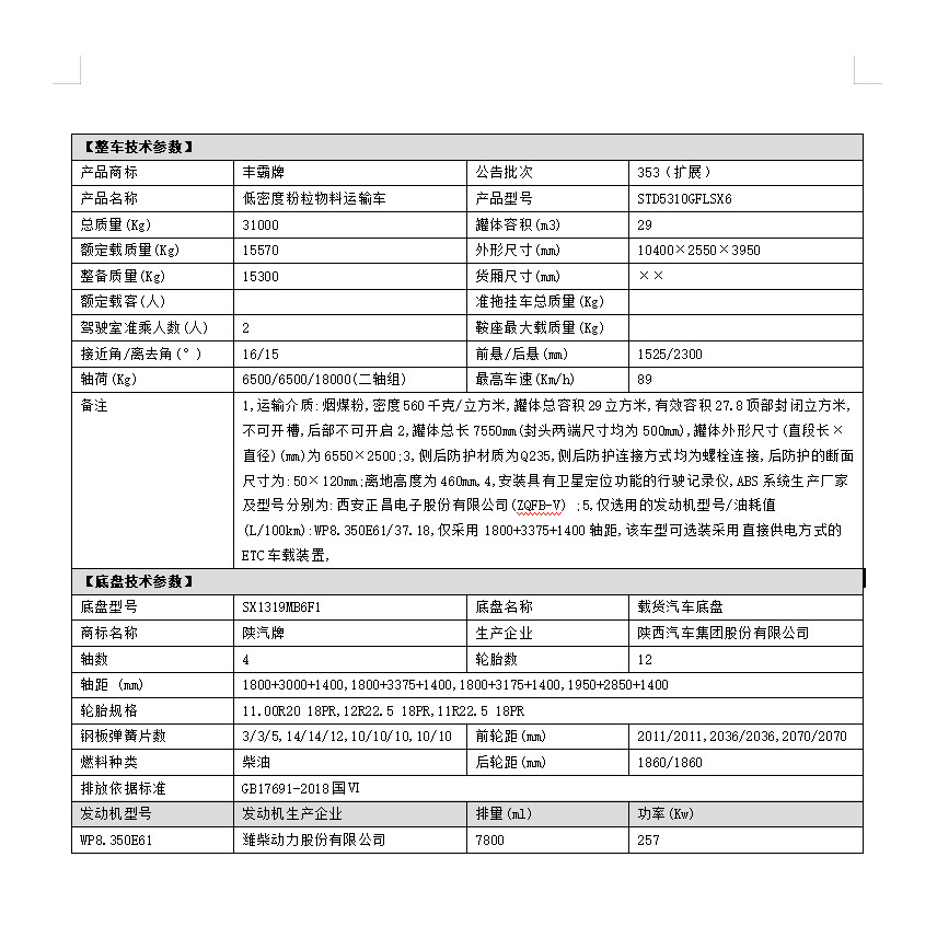 整車(chē)型號(hào)STD5310GFLSX6,底盤(pán)型號(hào)SX1319MB6F1,8×4驅(qū)動(dòng),濰柴350馬力WP8.350E61國(guó)6發(fā)動(dòng)機(jī),M3000駕駛室,法士特10檔變速箱,5.5噸雙前橋,13噸雙后橋,11.00R20鋼絲胎,300L鋁合金油箱,軸距1800+3375+1400mm,帶空調(diào)、行駛記錄儀及備胎。